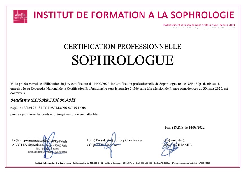 - en 2022 : spécialisations en sophrologie : Périnatalité / Enfants / Adolescents / Personnes âgées / Cancer / Sommeil.